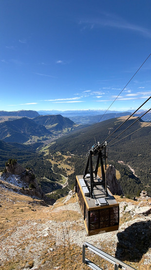 From Ortisei, the cable car glides up over forests, rooftops, and meadows, lifting you into crisp mountain air. As the cabin gains height, the world below becomes smaller, quieter — like life’s noise gets switched off.